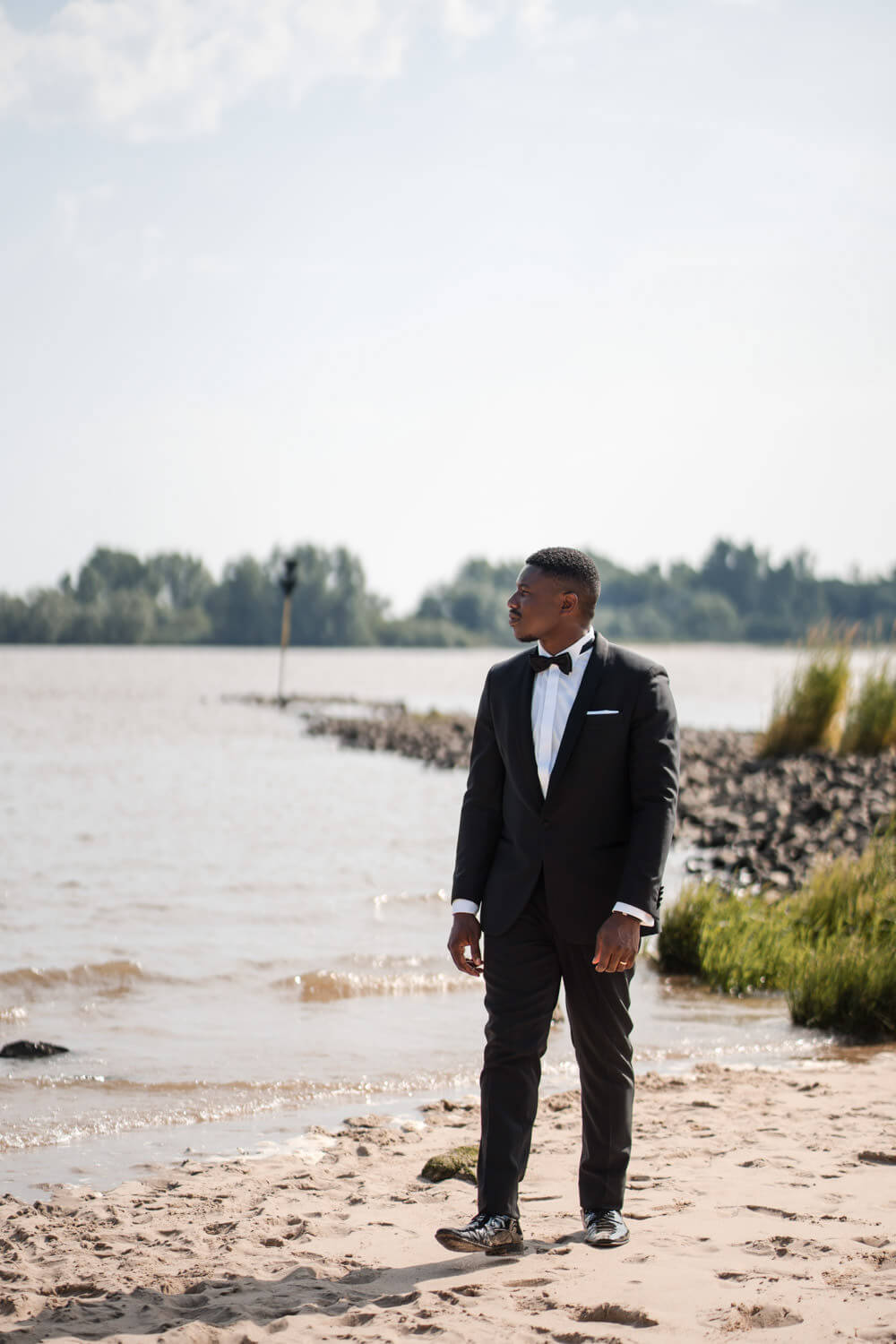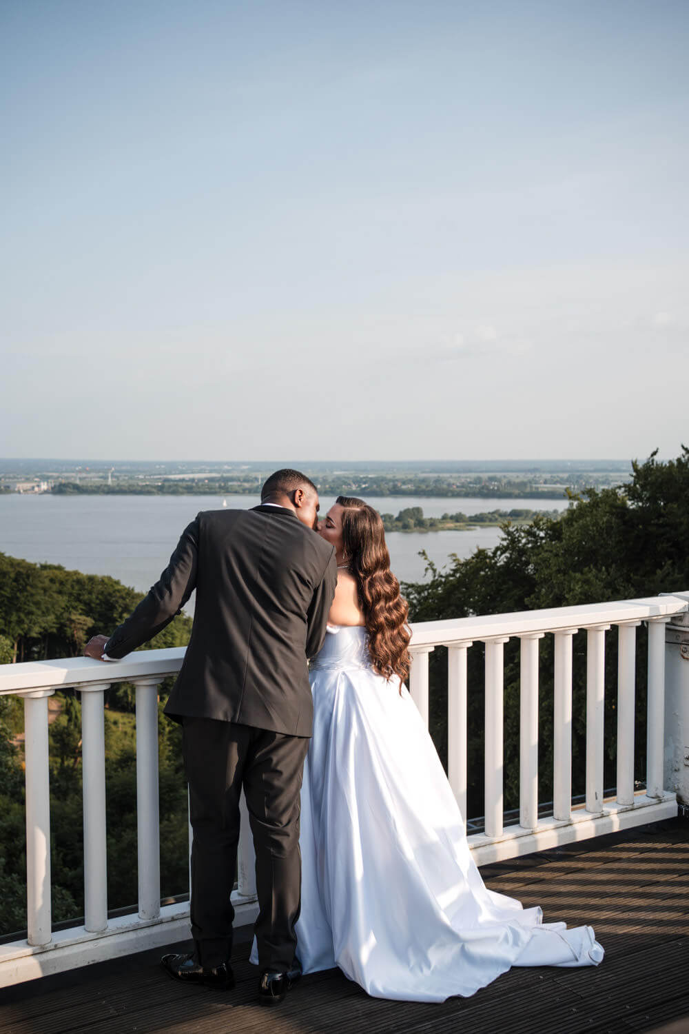 Nach der Trauung wartete auf der weitläufigen Terrasse ein stilvoller Sektempfang auf das frisch verheiratete Paar. Während die Gäste mit einem Glas Sekt und dem Blick auf die vorbeiziehenden Schiffe auf das Glück von Daniella und Chisom anstießen, nutzten wir die traumhafte Umgebung für ein ausgiebiges Fotoshooting. Die Mischung aus dem alten Baumbestand, der eleganten weißen Villa und dem Strandfeeling am Elbufer sowie das warme Licht des Juninachmittags machten diesen Teil des Tages zu einem Highlight für mich als Fotograf.