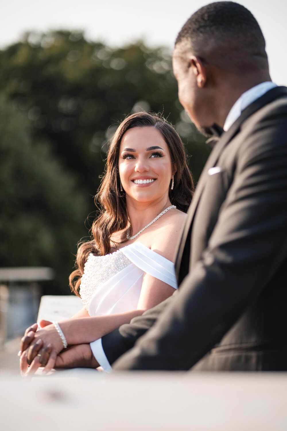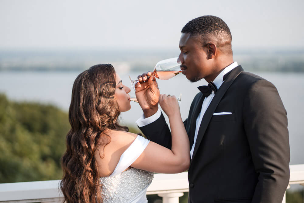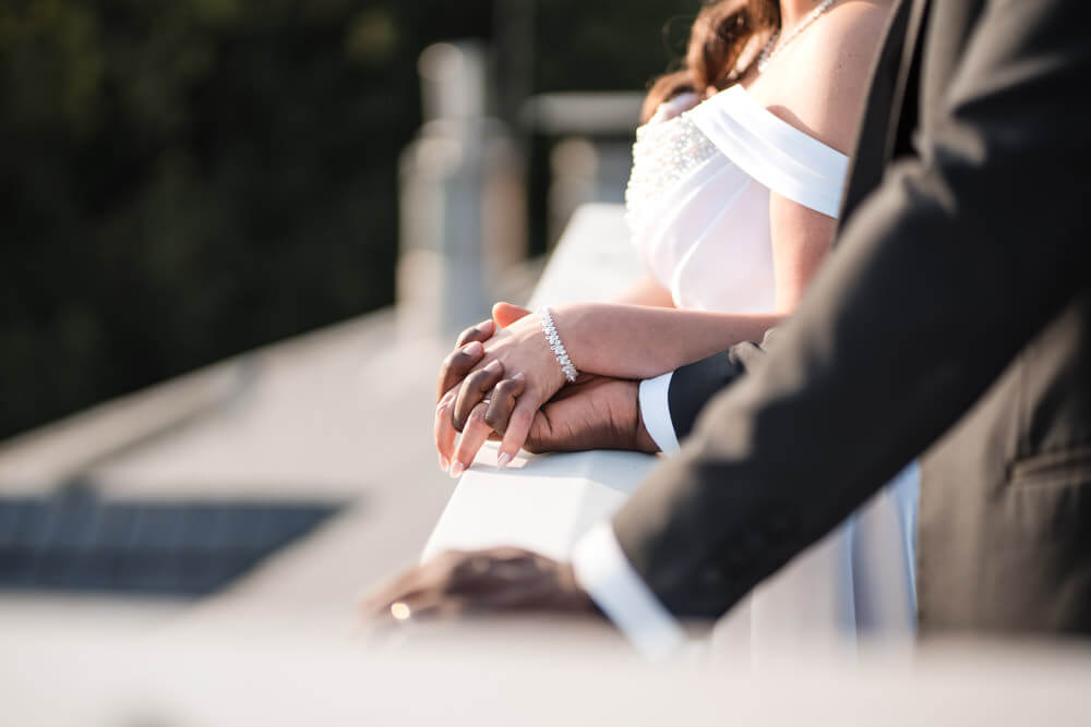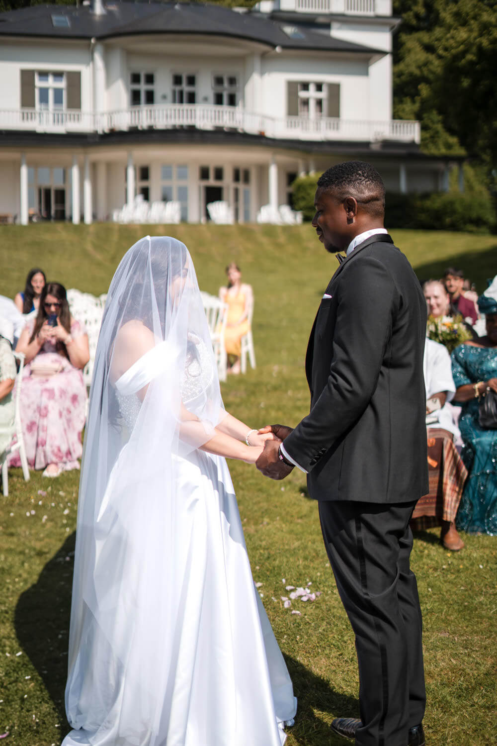 Das Lüften des Schleiers am Altar war ein symbolträchtiger Höhepunkt, der die tiefe Verbundenheit der beiden unterstrich. Umrahmt von der herrschaftlichen Architektur der Villa auf der einen und dem weiten Himmel über der Elbe auf der anderen Seite, gaben sich Daniella und Chisom ihr Versprechen. Es war eine Trauung, die die Leichtigkeit des Sommers mit klassischer Eleganz perfekt verband.